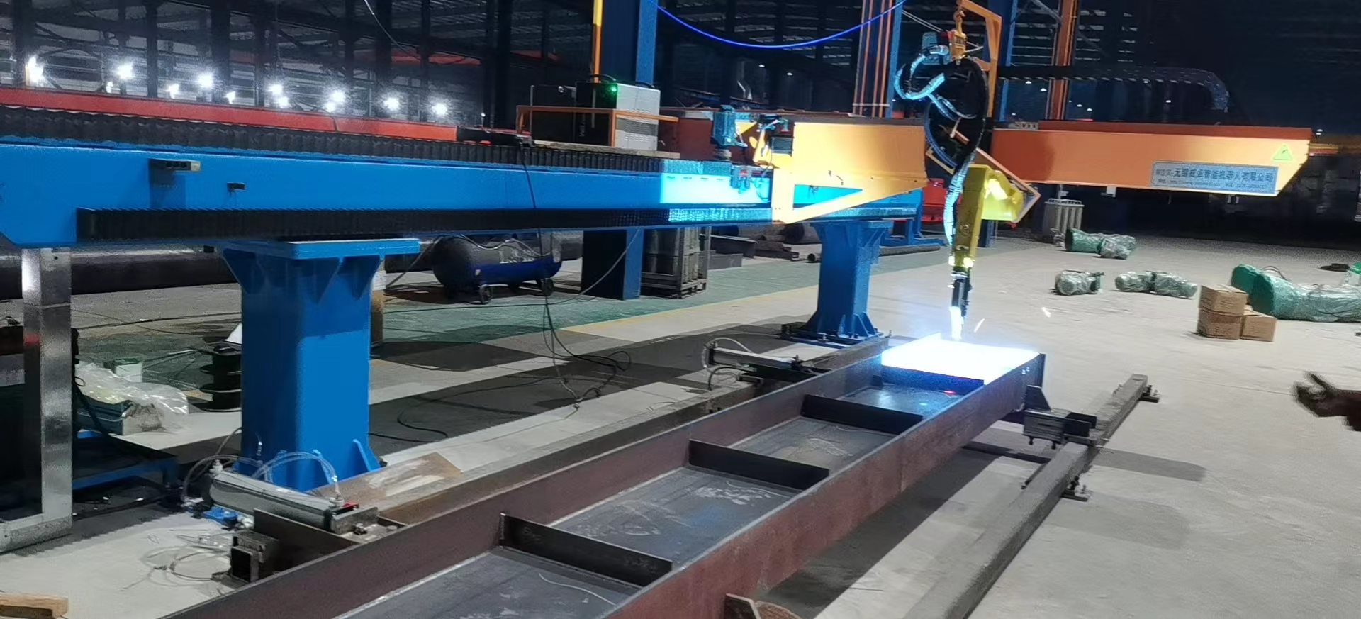 智能焊接在鋼構行業的成功應用針對鋼結構中常見的H型鋼等鋼梁工件,威卓設計研發了小龍門智能焊接工作站,焊槍部分使用鋼梁專用焊槍,更適用于鋼梁焊接;搭配傳感器使用,自動尋位識別焊縫,無